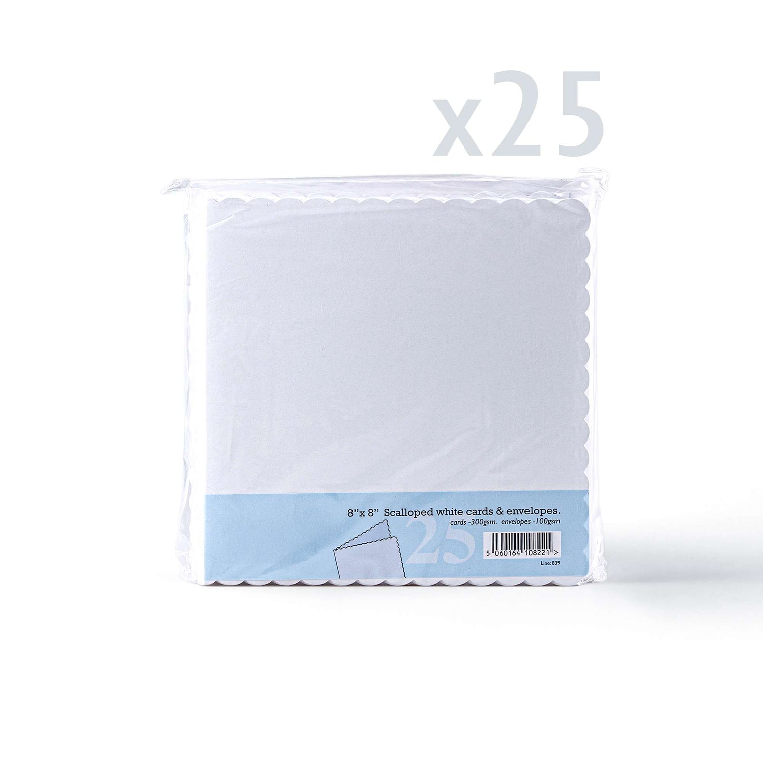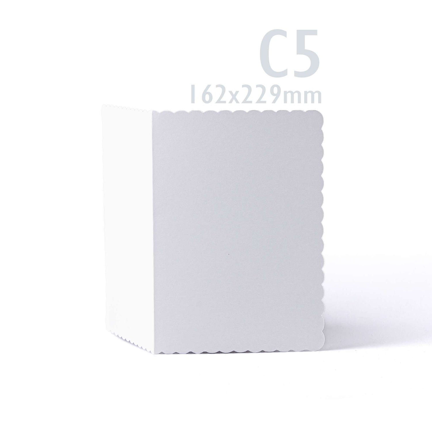 Elegant white scalloped cards (300 gsm) with matching envelopes (100 gsm).